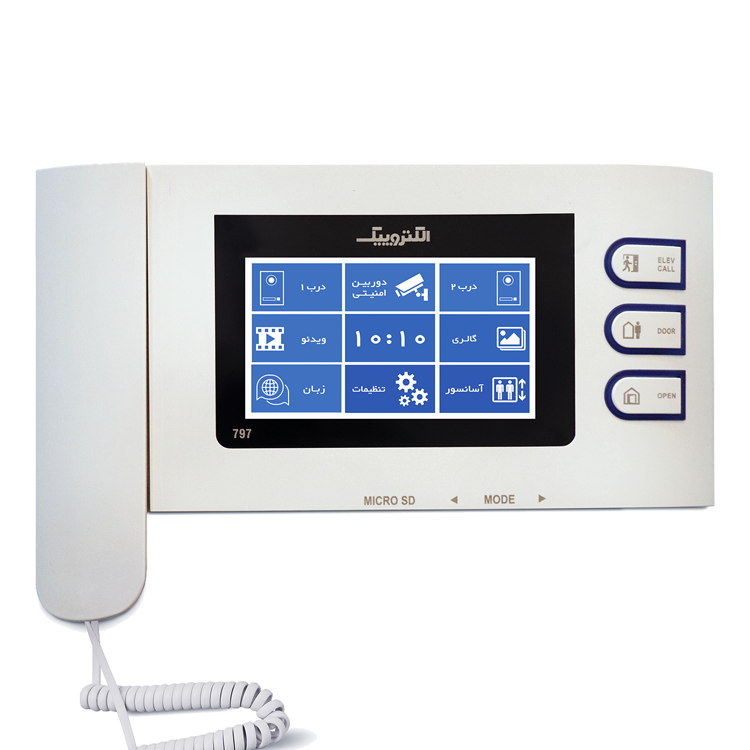 گوشی تصویری ۷۹۷ یکی از مدلهایی است که علاوه بر ظاهری زیبا دارای ویژگیهایی از قبیل، امکان فرمان به آسانسور، دارای حافظه داخلی و امکان نصب کارت حافظه، با امکان پشتیبانی فیلمها با ضبط صدای مراجعهکنندگان ،امکان اتصال به دوربین مداربسته ،امکان تنظیم ملودی و امکان تنظیمات رنگ و روشنایی در تصویر، تنظیمات زمان و تاریخ و قابلیت اتصال به دو پنل را دارد. این ویژگیها محصول گوشی تصویری مدل ۷۹۷ را تبدیل به یک گزینه مناسب برای افرادی کرده که علاوه بر قابلیتهای محصول، به ظاهر آن نیز توجه زیادی دارند نموده است. در تولید بردهای الکترونیکی محصول از فنّاوری SMT با پکیج ۰۶۰۳ استفادهشده است. همچنین فیبر بردهای الکترونیکی از نوع KB۶۱۶۰ است. از جمله قابلیت های این محصول میتوان به قابلیت فراخوانی آسانسور اشاره کرد. این قابلیت این امکان را فراهم می آورد که از درون واحد با فشردن دکمه تعبیه شده بر روی گوشی، کابین آسانسور را به طبقه ای که در آن ساکن هستید منتقل کنید که این امر باعث صرفه جویی در زمان شده و راحتی بیشتری را برای ساکنین منزل فراهم می آورد.