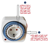 این تایمر قطع و وصل خودکار برق در واقع یک دستگاه زمانسنج است که میتواند در ساعات و دقیقههای مشخص که شما تعیین میکنید جریان برق را قطع یا وصل کند. به سخن دیگر این دستگاه را شاید بتوان یک پریز برق تایمردار نامید. محصول فوق برای مصارف مختلفی طراحی و ساخته شده که برخی از آنها عبارتند از: لوازم برقی داخل آشپزخانه، آکواریوم ، پکیج ، پمپهای آب ، تابلوی مغازه، مودم اینترنت و سایر مصارفی که نیاز به کنترل تحت زمان خاصی دارند. با استفاده از این محصول شما می توانید مویایل خود را با خیال راحت هنگام خواب به شارژ بزنید و بر اساس زمان دلخواه آن را تنظیم نمایید تا شارژ شود. روش تنظیم تایمر به این صورت است که : ابتدا حلقه ی پین های تایمر را به سمت عقربه های ساعت بچرخانید تا فلش قرمز رنگ روی زمان فعلی ، دقیق تنظیم شود سپس تایمر را به برق وصل کنید، هر کدام از پین های آبی رنگ 15 دقیقه میباشد که میتوانید با فشار دادن به سمت پایین ، تنظیم کنید که تایمر در این 15 دقیقه خروجی بدهد.