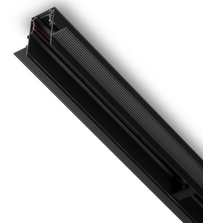 ریل از جنس آلومینیوم اکسترود با پوشش رنگ الکترواستاتیک مشکی مات است و به صورت شاخههای 3متری عرضه میشود. نوع اتصال چراغهای مختلف روی ریل براساس نیروی مغناطیسی است. عرض ریل 25 میلیمتر است. طراحی ریل روکار براساس نصب روکار و آویز در نظر گرفته شده است. شیار قسمت بالایی ریل اتصال به تجهیزات بکسل آویز را فراهم میکند. اتصالات به صورت مستقیم و زوایای مختلف، محدودیت اجرایی برای طراحیهای مختلف را از بین برده است.